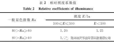 由图1可以看出,在其他条件相同的情况下,隧道照明光源的显色指数越高,越有利于驾驶员对障碍物的识别,有利于行车安全和照明节能。但目前尚没有有关对小目标的正确识别率相同时不同显色指数的光源所需提供照度之间关系的研究成果。隧道 照 明 设 计 应 对 光 源 显 色 性 提 出 要求,可以参考《工业企业照明设计标准》(GB 50034-1992)的相关规定执行。按照该标准第6.2.3条的规定,对颜色识别有要求的工作场所,当使用照度在500lx及以下,采用光源的显色指数较低时,宜提高其照度标准值,其提高值为其照度标准值乘以表2中相对照度系数值。