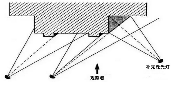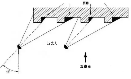 投射阴影的大小取决于建筑表面凹凸程度和照明光线的投射角度。照明光线的平均方向角度与表面法线应该不小于45度,为了突出一个特别低的凸面应该增加投射角度。