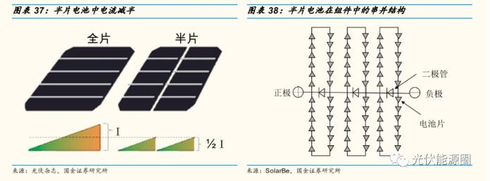 半片电池技术使用激光切割法沿着垂直于电池主栅线的方向将标准规格电池片(156mmx156mm)切成相同的两个半片电池片(156x78mm)后进行焊接串联。为了与整片电池构成的组件在电气参数上一致,应在组件内部进行电池片的串并联。一种可能的连接方式为:每 20 片半片串联,与另外一串20 个半片并联,再整体与第二个这种并联体串联,再与第三串串联,仍旧使用三个旁路二极管。