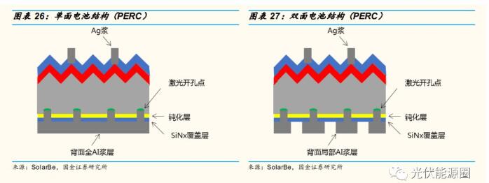 电池背面效率略低于正面,背面透光导致正面效率略降:由于激光开孔点仍然需要栅格来疏导光生电流,故电池背面大部分区域仍覆盖了Al/Ag 浆,且铝栅格导电性不如银栅格,故铝栅线较宽,背面覆盖率高达 30%~40% , 因 此 背 面 可 吸 收 光 线 的 区 域 有 限 , 转 化 效 率(10%~15%)明显低于正面(20%以上)。同时,由于背面由全 Al 层改为局部覆盖,透光量增加,电池正面效率可能会下降 0.2-0.5%。