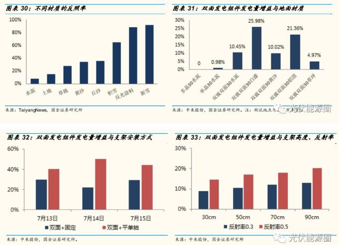 系统层面,发电量增益 5%~30%。双面电站系统的性能主要受系统设计及安装环境的影响。在同等标称峰值功率、安装地点的情况下,双面发电组件发电量增益 15%~20%;增加组件高度及地面反照率后增益可达30%;