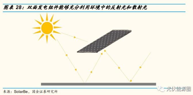 双面电池背面采用铝浆印刷与正面类似的细栅格,背面由全铝层覆盖改为局部铝层。背面的入射光可由未被 Al 层遮挡的区域进入电池,实现双面光电转换功能,相当于增加了电池受光面积, 从而增加发电量。与单面双玻组件类似,双面发电组件背面也采用玻璃或透明背板进行封装,优化组件性能的同时增加背面透光量。
