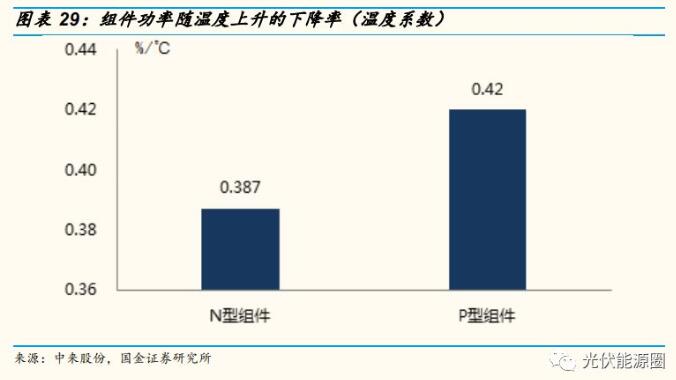 工作温度低,降低功率损失。温度会对太阳能晶硅电池的开路电压、短路电流、峰值功率等参数产生影响,温度升高 1℃,峰值功率损失0.35% ~ 0.45%。双面电池的背面是高透光的 SiNx材料,红外光线可以穿透电池,不被电池吸收,正常工作下的温度较常规组件低 5~9℃,减少功率损失。