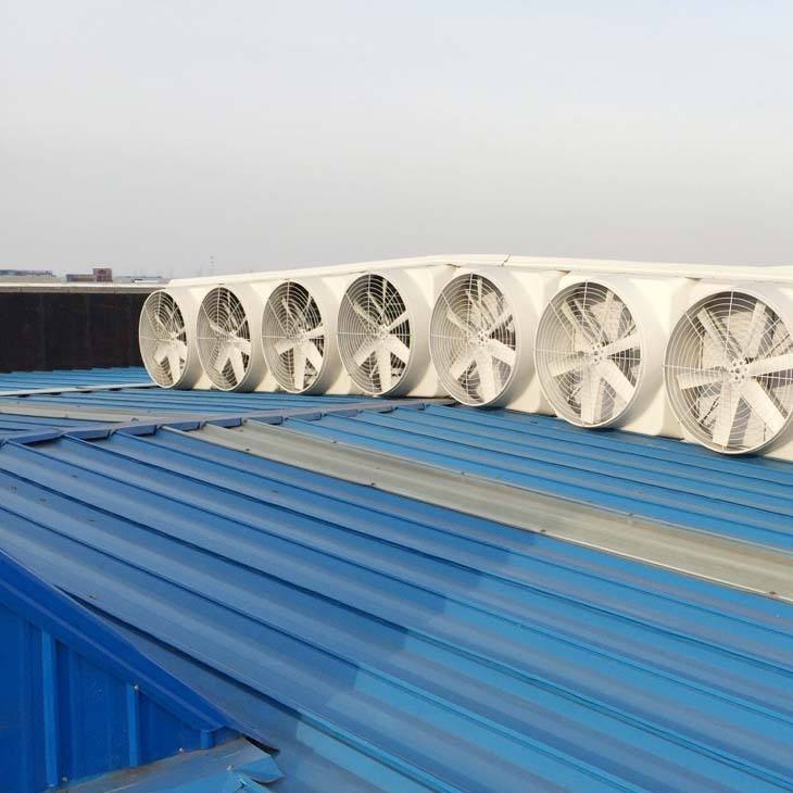 1、换气降温:由于阳光照射建筑物、机器设备、人体等热源导致需要通风的场所气温高于室外。负压风机能将室内热气迅速排出,让室温和外界温度持平,不至于车间内温度升高。