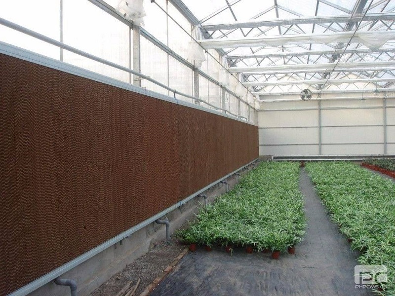 首先,我们将了解风扇的原理。当室外热风通过充满水的湿帘吸入时,湿帘上的水吸收热量并蒸发,从而降低进入温室的空气温度。通常情况下,由湿帘、湿帘配水系统、水泵、水箱组成的“湿墙”沿温室的一面墙连续施工,风机集中在温室的另一面墙上。湿帘必须保持湿润,以确保蒸发和冷却过程的完成。根据温室的大小和所在区域,可在湿幕对面的墙壁上安装合适的风扇,使空气通过温室畅通无阻。