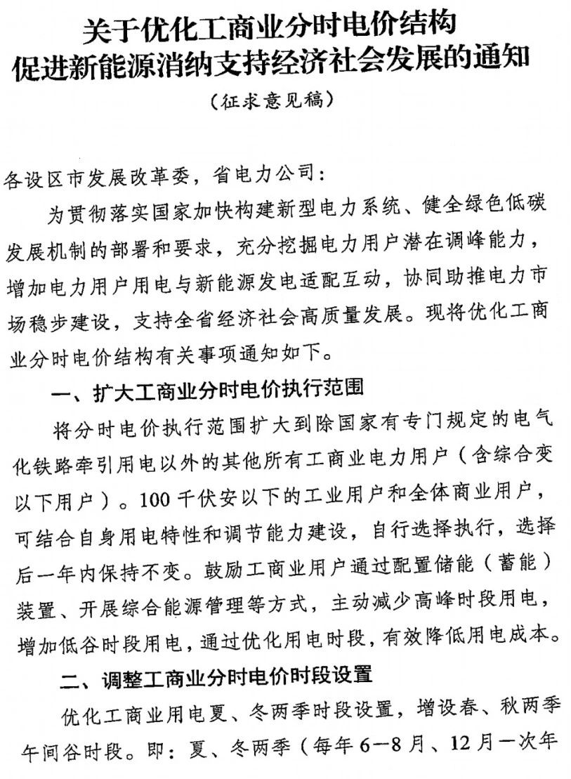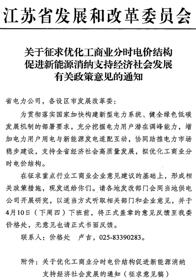 近日,江苏省发改委发布《关于征求优化工商业分时电价结构促进新能源消纳支持经济社会发展有关政策意见的通知》。