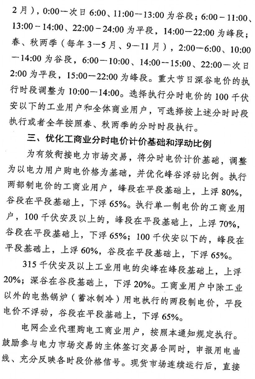 315千伏安及以上工业用电的尖峰在峰段基础上,上浮20%;深谷在谷段基础上,下浮20%。工商业用户中除工业以外的电热锅炉(蓄冰制冷)用电执行的两段制电价,平段电价不浮动,谷段在平段基础上,下浮65%。